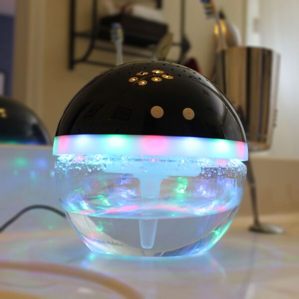 The EcoGecko Magic Ball is a powerful workhorse for neutralizing unpleasant odors in your space. Simply fill the bowl with tap water, add a few drops of the included Lavender oil and turn on the freshness. The unit has a fan system that sucks the air from the room into the water. The air is pushed through the aroma oil scented water, particles are trapped in the water and pleasantly scented air is released back into your room. The gently swishing water creates soothing white noise for a peaceful and restful environment. LED Lights give the unit a whimsical feel. You chose multi-color, chasing, alternating color, solid or no color at all.